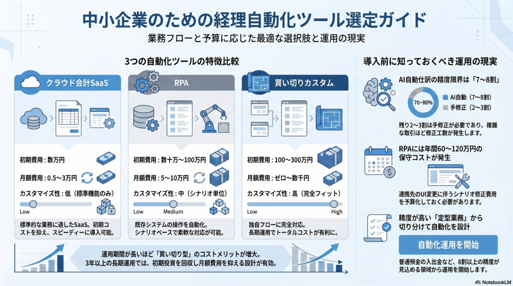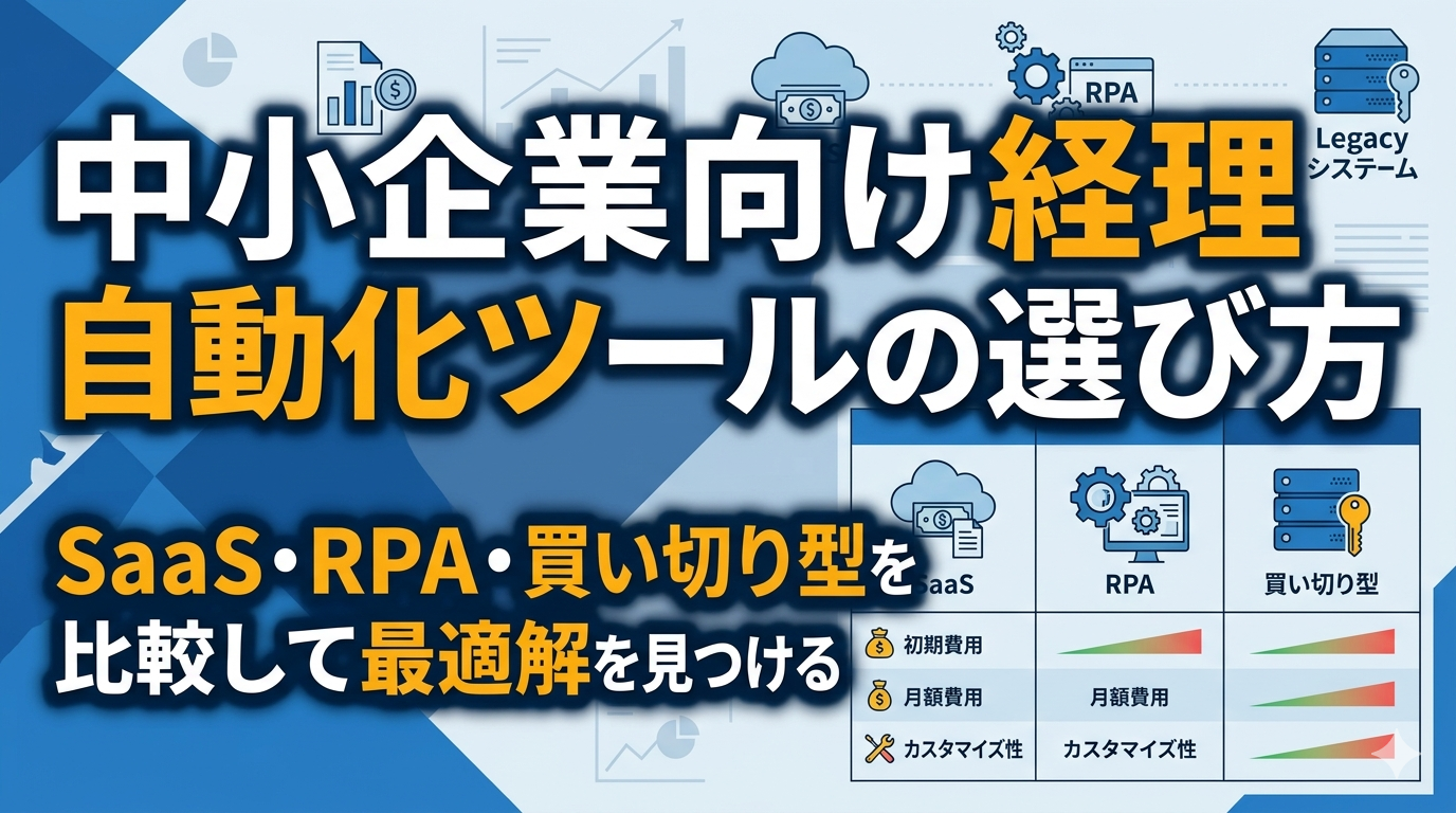 本記事を読めば、中小企業の経理業務で実際にボトルネックになっている工程を特定し、SaaS・RPA・買い切り型ツールの向き不向きを判断して、3年TCOで最適な自動化手段を選定できるようになります。