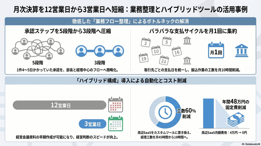 業務フロー整理+ハイブリッドツール導入の結果、月次決算にかかる日数が12営業日→3営業日に短縮されました。経営会議資料が月初5営業日以内に完成する体制となり、経営判断のスピードが大幅に改善しました。