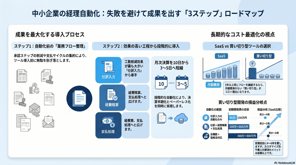 中小企業の経理自動化で最も重要なのは、ツール選定の前に業務フロー自体を整理することです。承認ステップの削減・支払サイクルの統一・取引先マスタの整備といった基礎整理で、自動化効果の半分は達成できます。