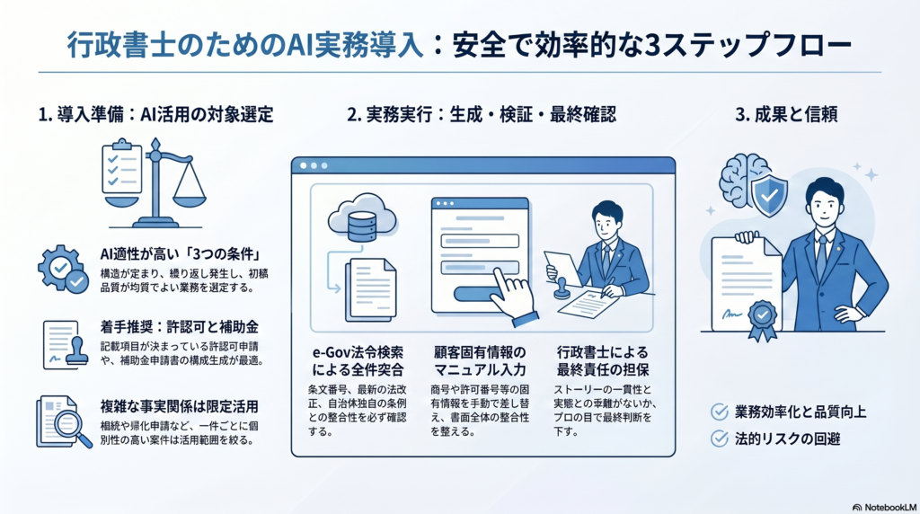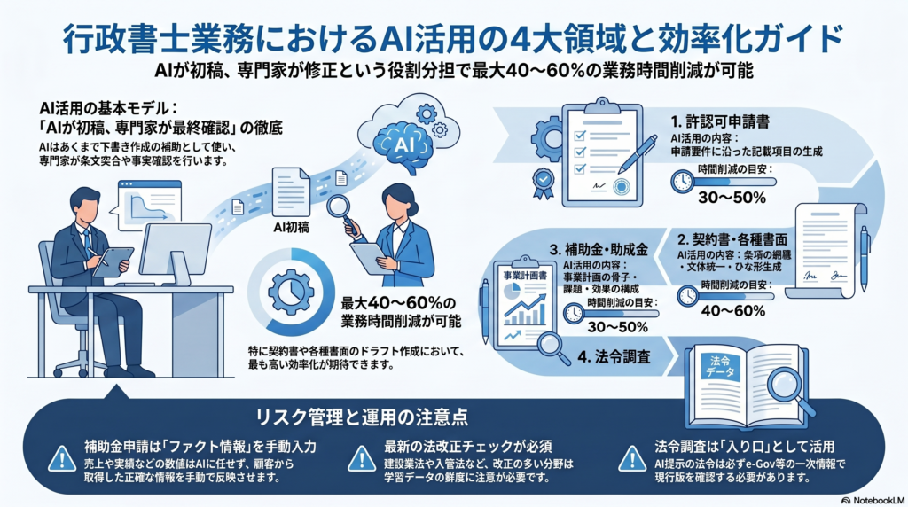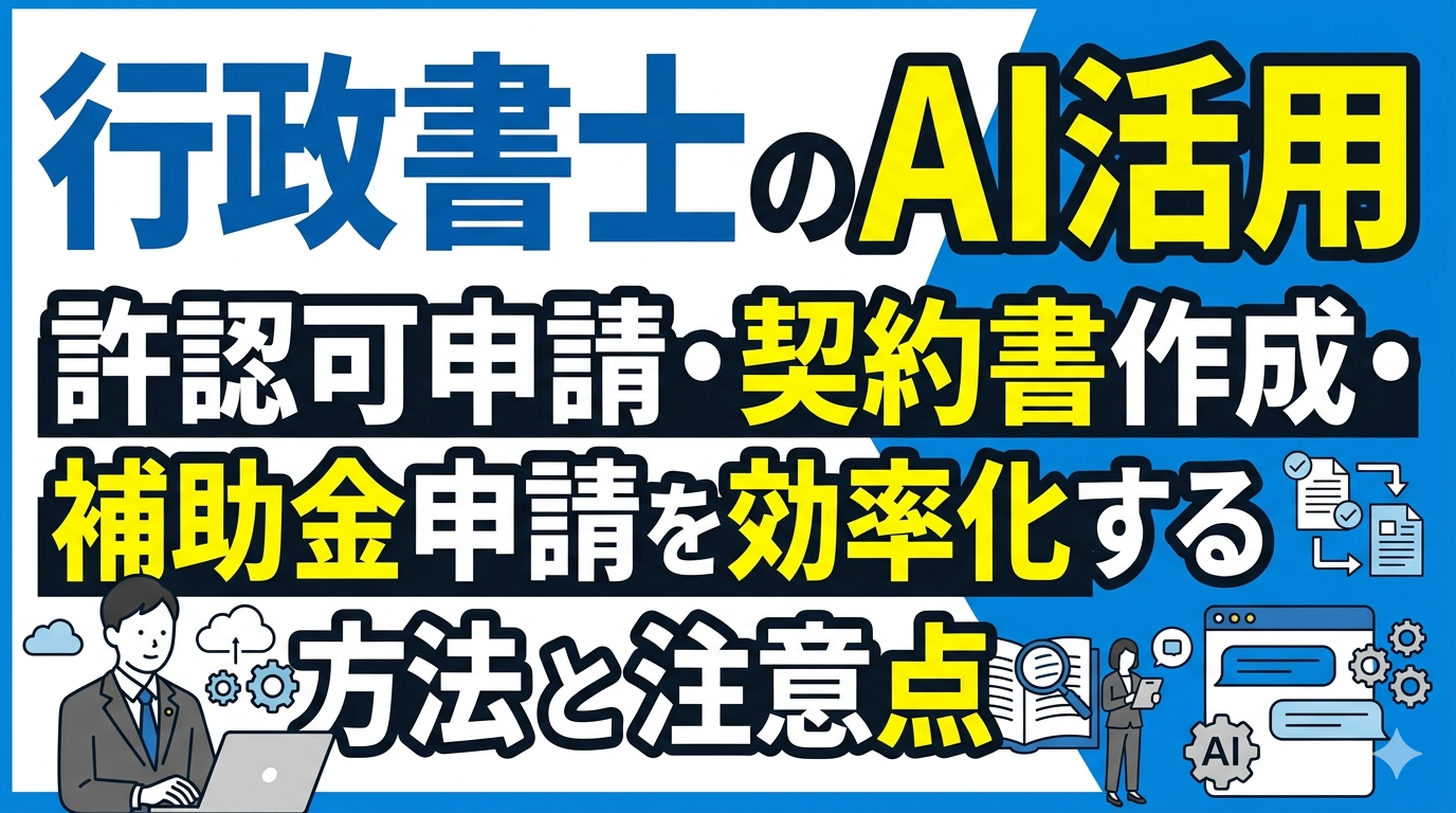 行政書士業務のAI活用は、許認可申請書・契約書・補助金申請書の初稿生成から始め、法令突合チェックと最終レビューとセットで運用することが安全かつ効果的な進め方です。