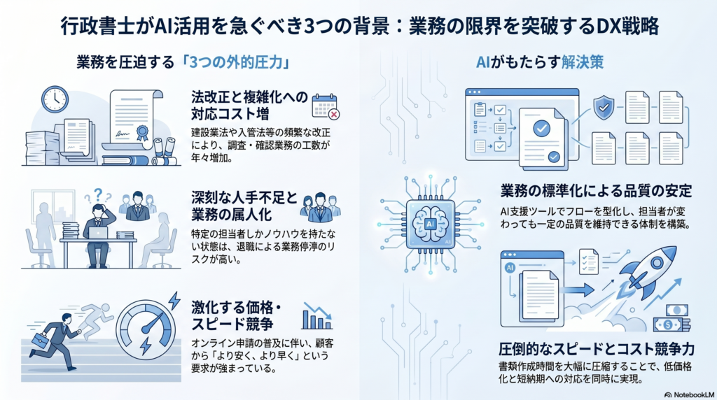 行政書士事務所がAI活用を検討する背景には、業務量の増加・人材確保の困難・価格競争という3つの圧力があります。
