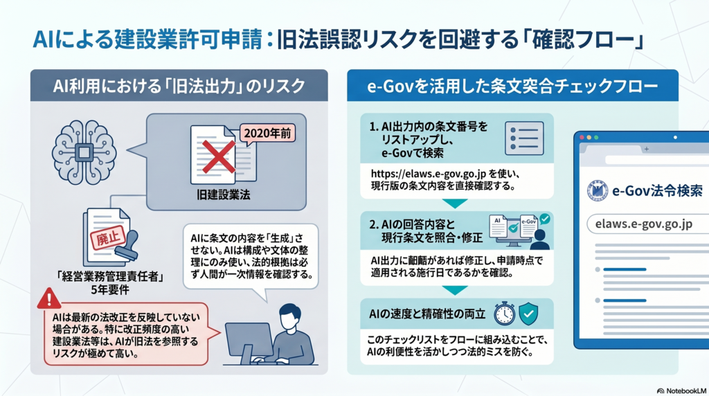 この問題の根本は、AIの学習データに含まれる法令情報が常に最新とは限らないという性質にあります。特に改正頻度の高い建設業法・入管法・食品衛生法などの分野では、AIが参照している情報が現行法と異なるケースが頻発します。