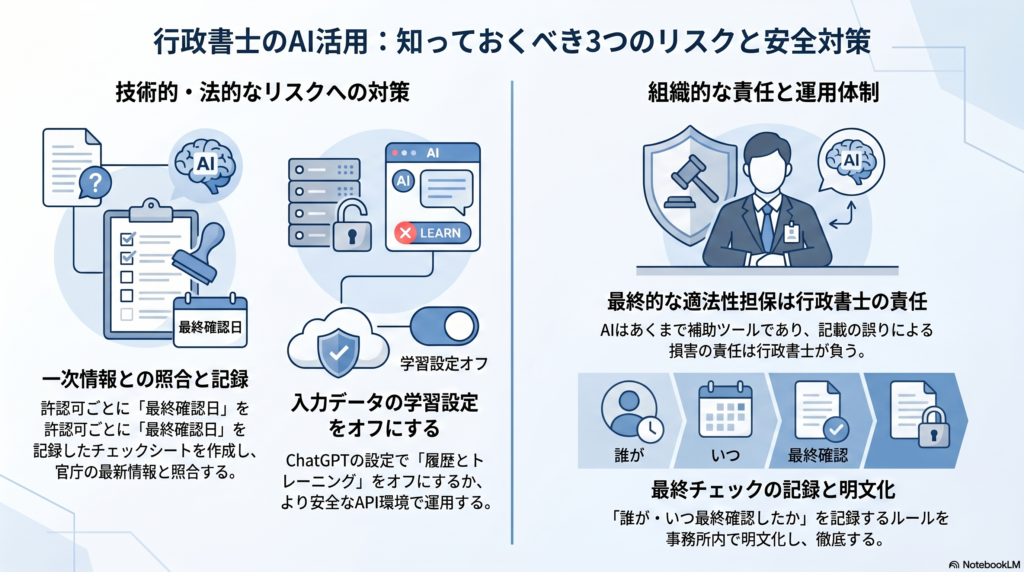 AIはあくまで作業補助ツールであり、書類の最終的な正確性と適法性を担保する責任は行政書士にあるというルールを事務所内で明文化し、スタッフ全員に徹底することが重要です。AI出力を使う場合は、誰がいつ最終チェックを行ったかを記録に残す運用を整備してください。