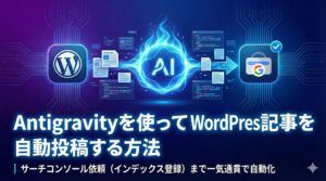 Antigravityを使ってWordPress記事を自動投稿する方法|サーチコンソール依頼(インデックス登録)まで... 多くのメディア運営者や企業のマーケティング担当者が、記事の企画・執筆よりも「記事投稿設定・サーチコンソール依頼(インデックス登録)」というルーチンワークに時...