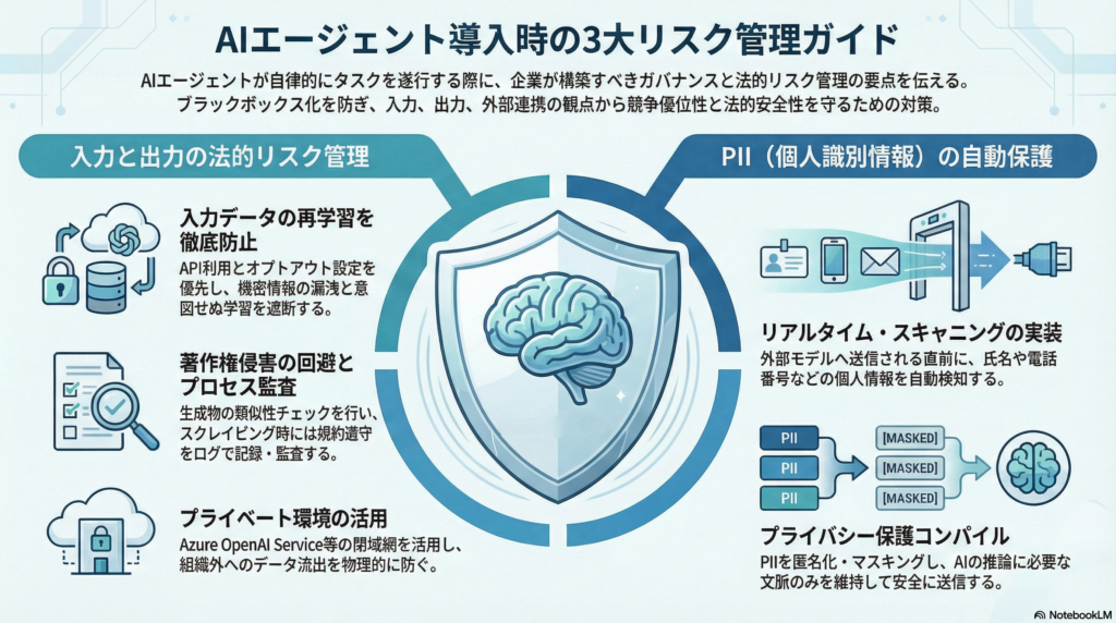 AIエージェントが自律的にタスクを遂行する上で、入力データの取り扱いと出力に関する法的リスクの管理は、ガバナンスの根幹をなす最重要事項です。エージェントのタスク処理が「ブラックボックス」にならないよう、以下の3つの観点から厳格な管理体制を構築する必要があります。
