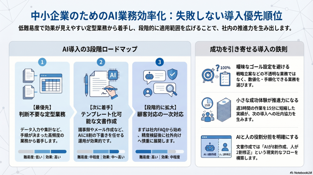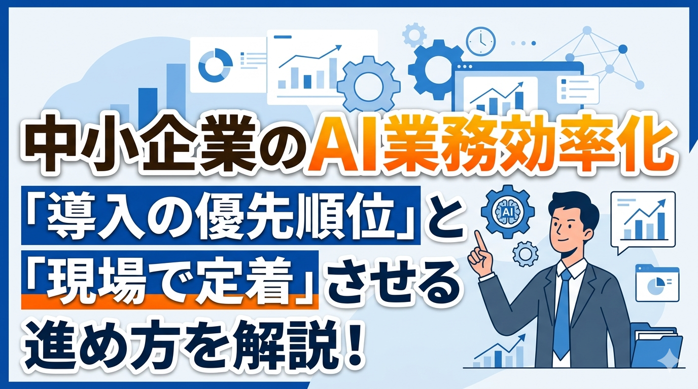 中小企業のAI業務効率化は、ツール選びよりも「どの業務から着手するか」「どう現場に定着させるか」の設計が成果を分けます。
