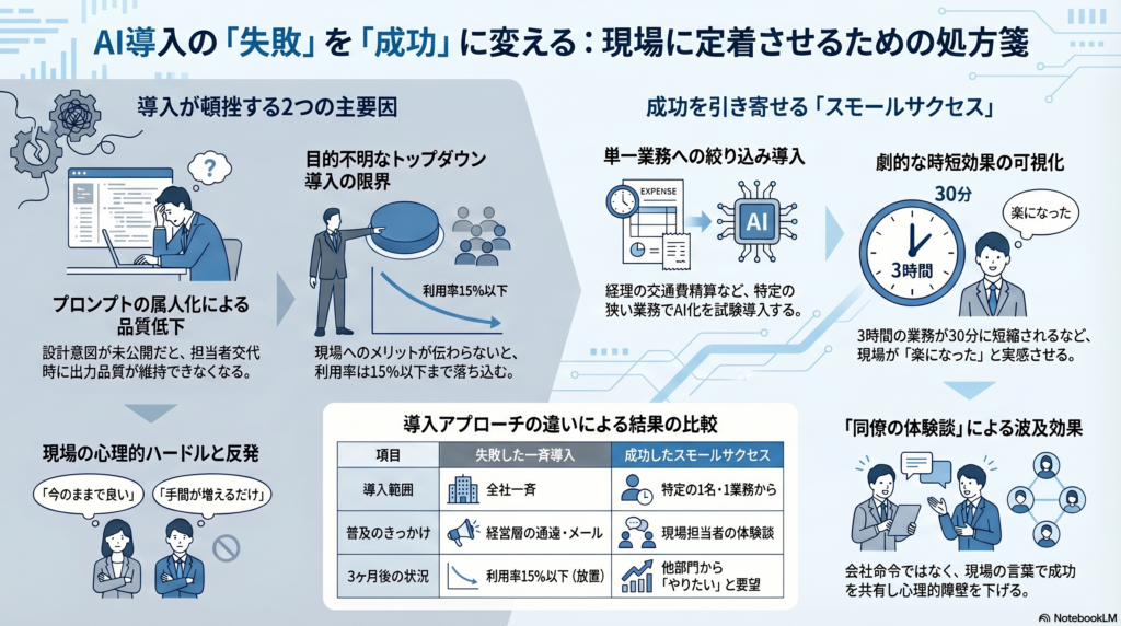ポイントは、最初の成功事例を「会社が命じた効率化」ではなく「現場の担当者が自分の言葉で語る体験談」として広めたことです。トップダウンの通達よりも、隣の部門の同僚が「使ってみたら本当に楽になった」と言うほうが、現場の心理的なハードルは圧倒的に下がります。