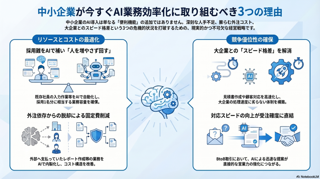 中小企業がAI業務効率化に取り組むべき理由は、単に「便利になるから」ではありません。人手不足・コスト増・競争力の低下という3つの構造的な課題が、AIの導入を後回しにできない状況を作り出しています。