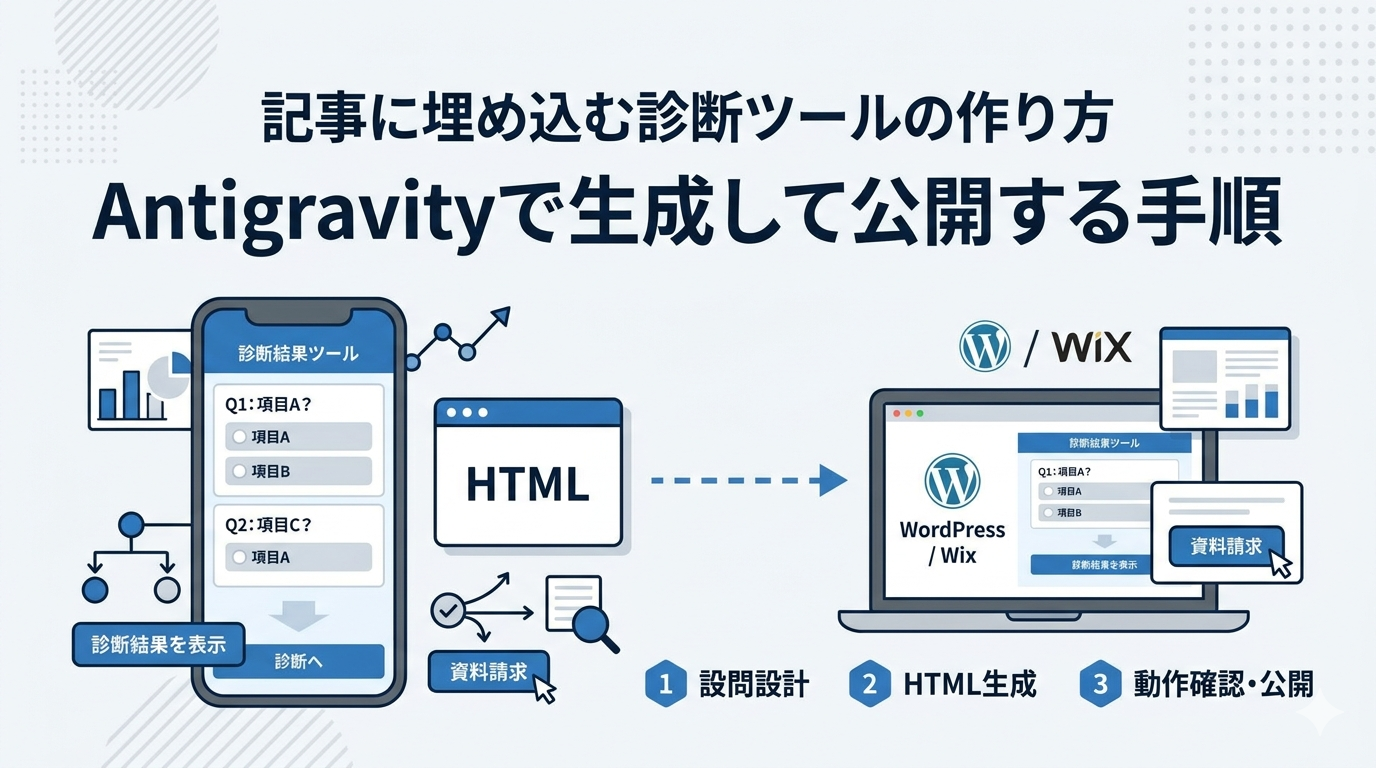 記事に埋め込む診断ツールをAntigravityで作るときの要点は、次の3つです。