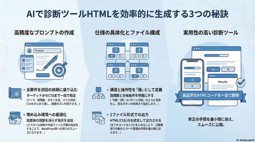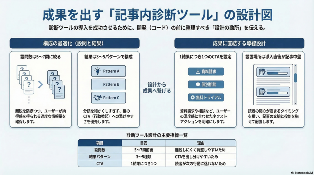 記事に埋め込む診断ツールは、コード生成そのものよりも、先に設問設計と結果導線を固めておくことが重要です。特に、設問数、分岐条件、結果ごとのCTAが曖昧なままHTMLを生成すると、見た目は動いていても、診断結果と導線がかみ合わず成果につながりにくくなります。