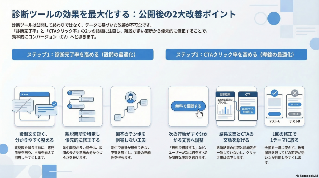 公開後は、完成ではなく改善フェーズに入ります。診断完了率とCTAクリック率の2点を見るだけでも、次の修正方針が立てやすくなります。