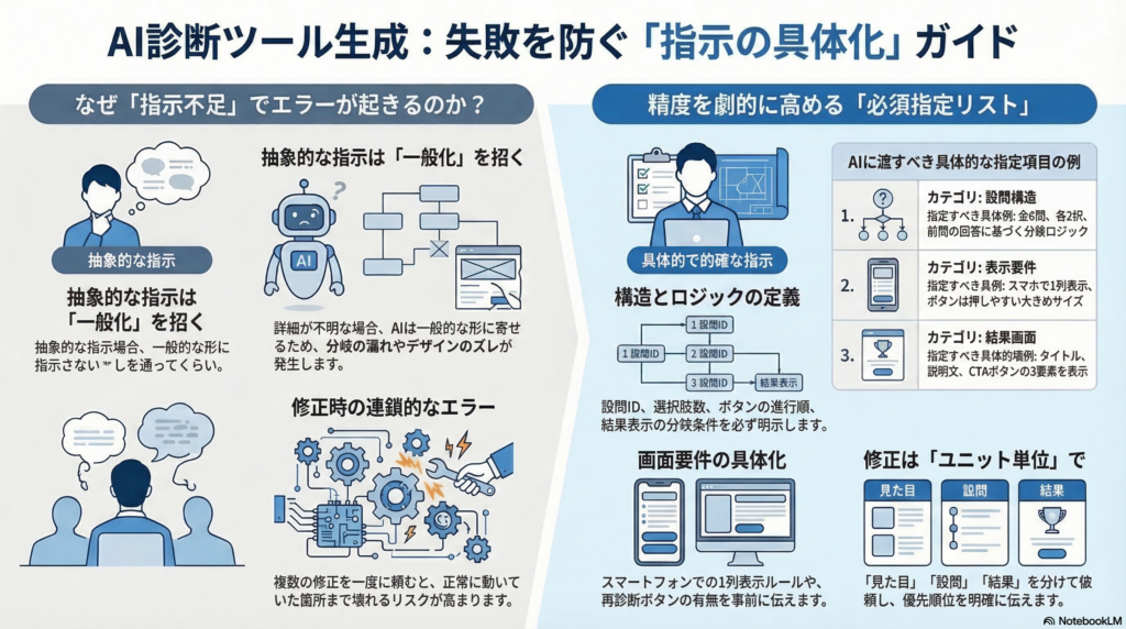 AIは、結果表示の見せ方、設問の進み方、分岐条件、デザインの方向性が見えないと、一般的な形へ寄せて出力します。その結果、意図しないレイアウト崩れや、結果分岐の漏れが起きやすくなります。記事本文のトーンと診断ツールの見た目がズレるのも、この段階の指定不足が原因になりやすいです。