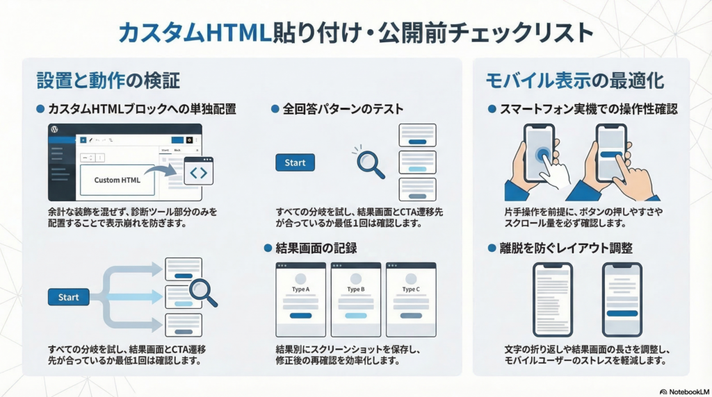 WordPressならカスタムHTMLブロック、WixならHTML埋め込み枠へ貼り付ける進め方が分かりやすいです。貼り付け時は、余計な装飾ブロックを混ぜず、診断ツール部分だけを単体で配置すると崩れにくくなります。本文幅いっぱいに広げるのか、本文内の通常カラムに収めるのかも先に決めると、デザイン調整のやり直しを防げます。