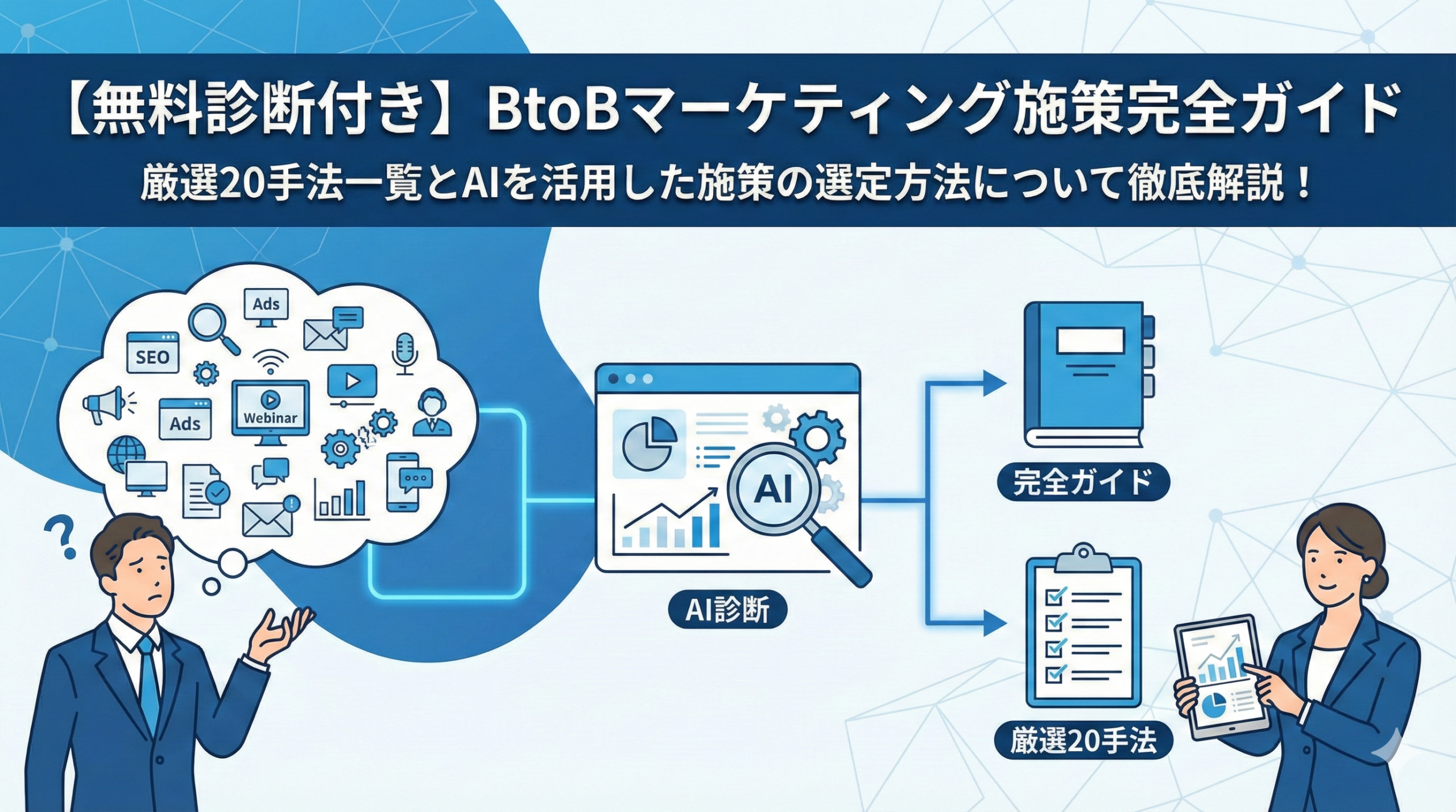 そこで本記事では、自社に必要なBtoB施策の無料診断ツールの提供(※個人情報登録不要※)、厳選した20の施策一覧、施策選択ガイドをご提案いたします。