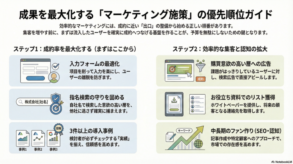| 獲得(出口) | EFO(入力フォーム最適化) | 離脱防止・CVR向上 | 低 | 高 |