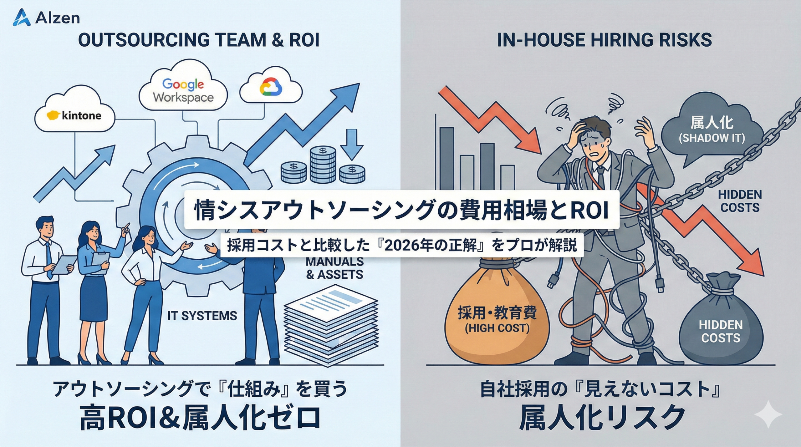 kintone導入支援やGoogle Workspaceの最適化を進めてきた私たちAIzen株式会社の視点から、失敗しない費用相場の見極め方と、戦略的なアウトソーシングの活用法を解説します。