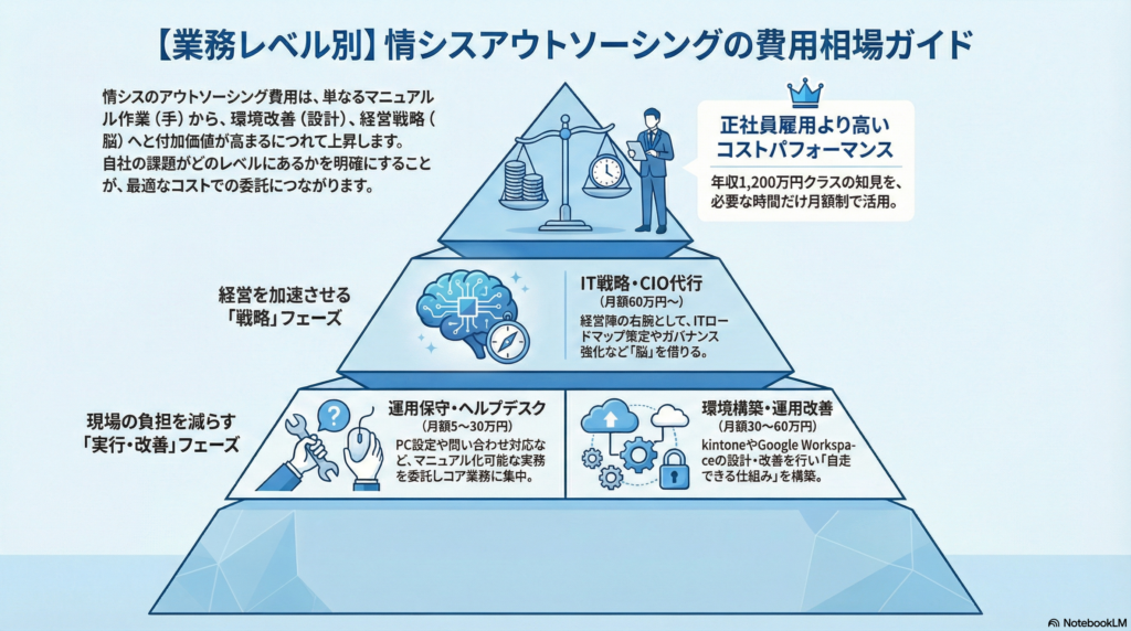 単なるマニュアル作業を任せるのか、それとも経営に直結するIT戦略を任せるのかによって、月額数万円から100万円超まで大きな幅があります。