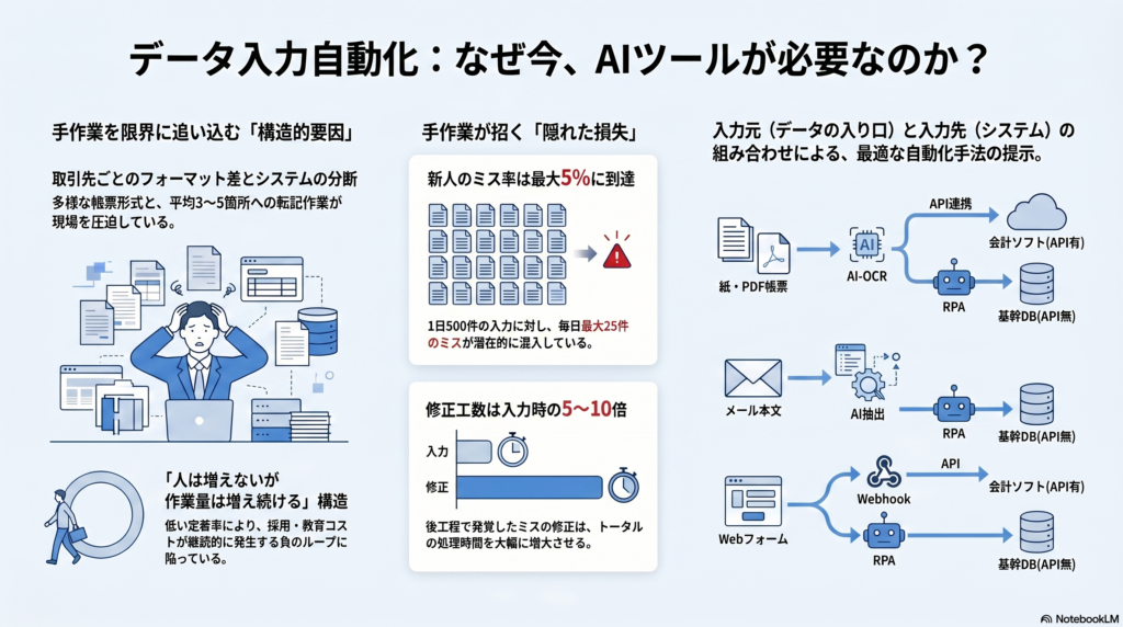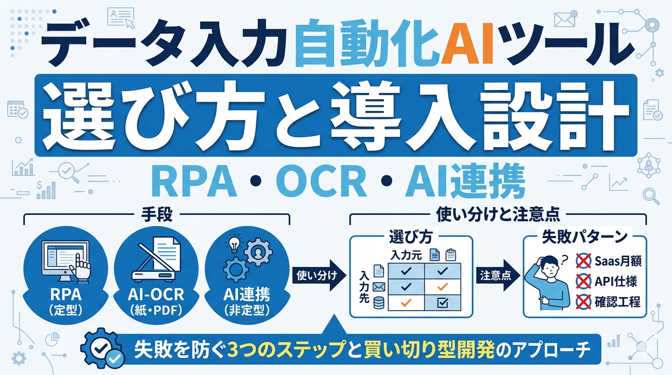本記事を読めば、データ入力の月間工数を数十時間単位で圧縮し、転記ミスと入力遅延を構造的に解消するための手段選定と導入設計が理解できます。