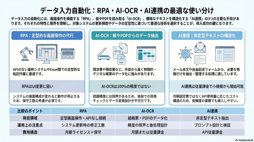 データ入力自動化の3つの手段:RPA・OCR・AI連携の使い分け
