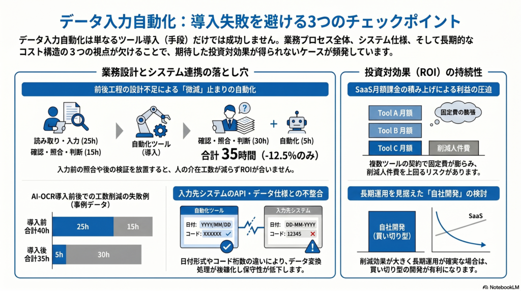 最も頻発する失敗は、入力作業そのものだけを自動化し、前後の工程を設計していないケースです。データ入力業務は「入力」だけで構成されているわけではなく、入力前の確認(取引先情報の照合・在庫確認・単価確認)、入力後の照合(二重登録チェック・整合性検証・承認)が含まれています。
