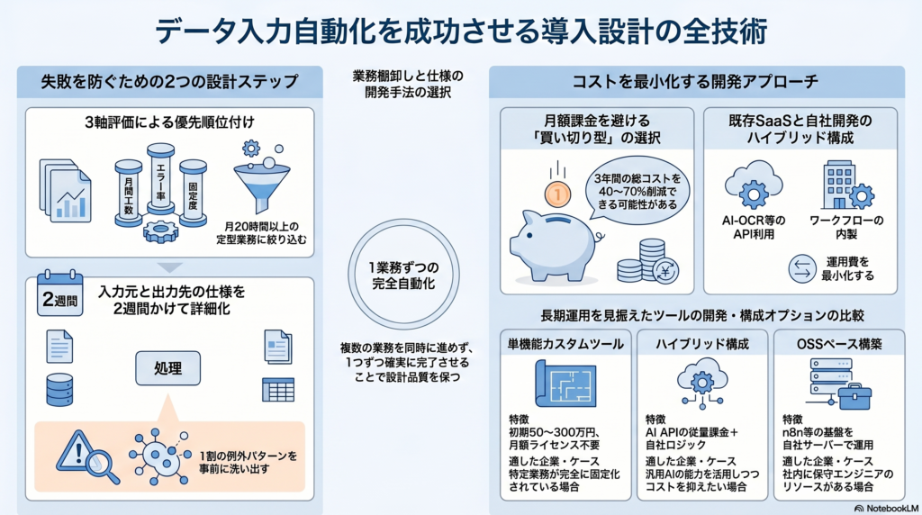 自動化を設計する際は、「入力に至るまでの判断・照合」と「入力後の検証・承認」を含めた全工程をマッピングし、どこまで自動化するかを事前に決める必要があります。