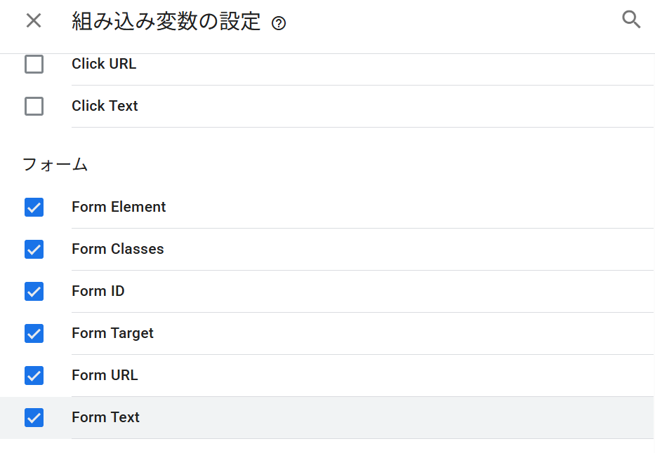 GTMがフォームの動作を検知するために必要な「変数」を有効にします。