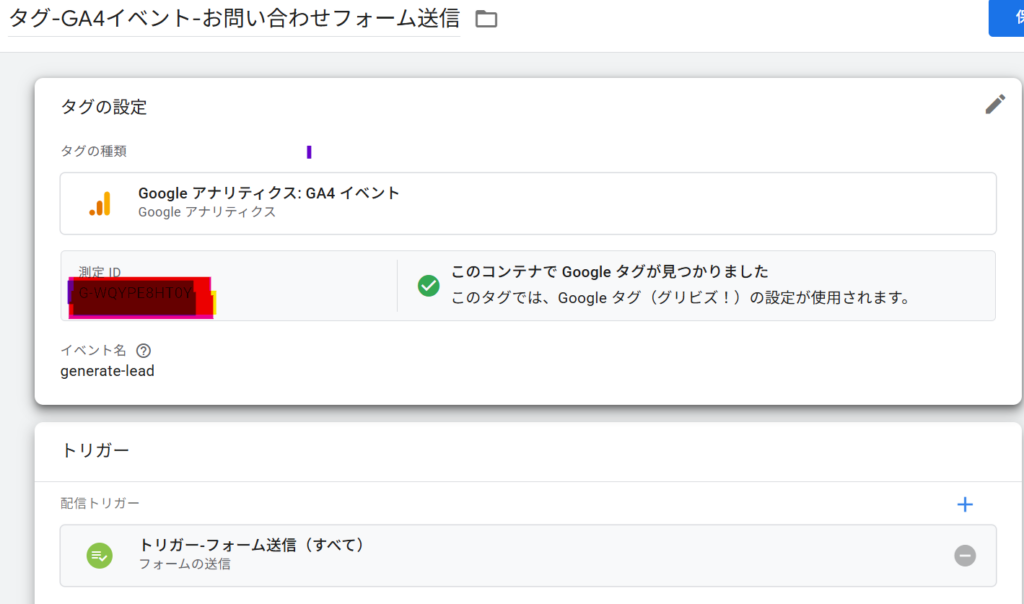6. GTMのワークスペースに戻り、先ほど作成した「トリガー – フォーム送信(すべて)」を開きます。