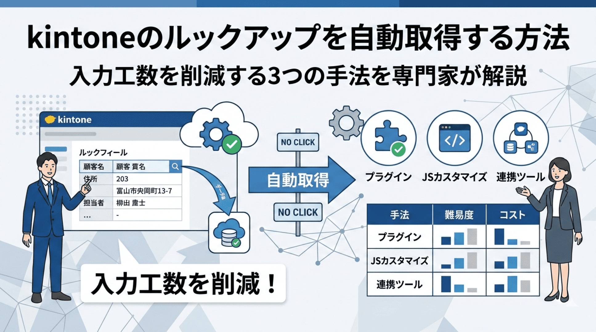 本記事では、ルックアップが自動取得できない理由を仕組みから解説した上で、プラグイン・JavaScriptカスタマイズ・連携ツールの3つの手法を比較し、導入時の注意点まで網羅的にお伝えします。