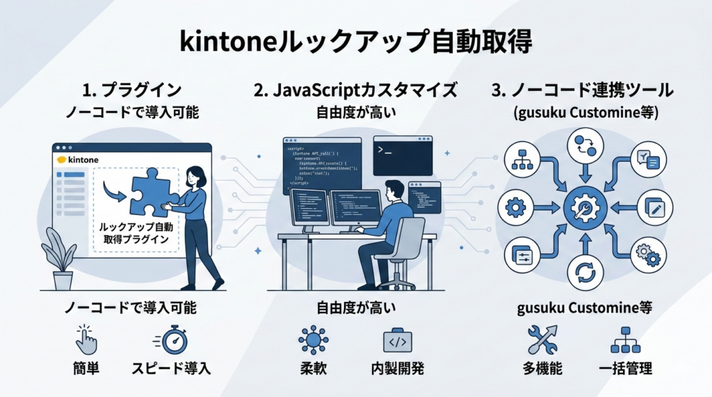 kintoneのルックアップ自動取得を実現するには、主に「プラグイン」「JavaScriptカスタマイズ」「ノーコード連携ツール」の3つの選択肢があります。それぞれにメリット・デメリットがあるため、自社の体制やスキルレベルに合った手法を選ぶことが重要です。以下の比較表で、各手法の特徴を整理しました。