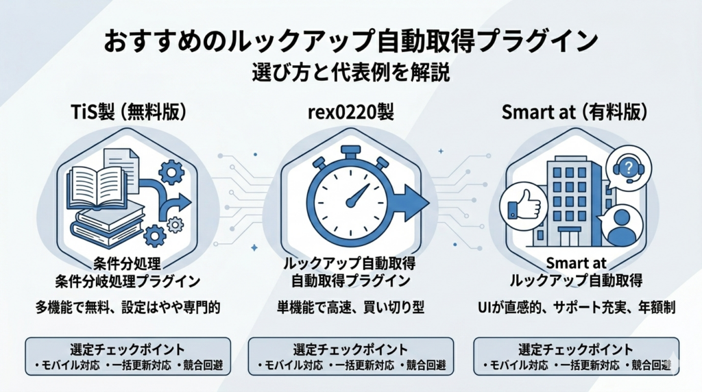 まずは無料で利用できるTiS製の「条件分岐処理プラグイン」の自動ルックアップ機能で検証を行い、設定の難易度が高いと感じたり、より専用の機能が必要と判断した場合は、rex0220の「ルックアップ自動取得プラグイン」(11,000円・買い切り)やSmart atの「ルックアップ自動取得プラグイン」(年額50,000円)の導入を検討するのが最も効率的なルートです。