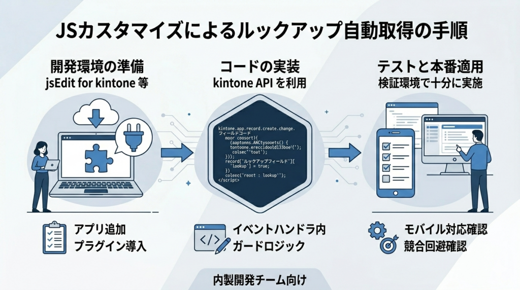 プラグインでは対応しきれない複雑な要件がある場合や、社内にJavaScriptの知識を持つエンジニアがいる場合は、カスタマイズによる実装が選択肢に入ります。ここでは、エンジニア向け、あるいはJSカスタマイズの内製化を検討しているチーム向けに、実装の流れと注意点を解説します。