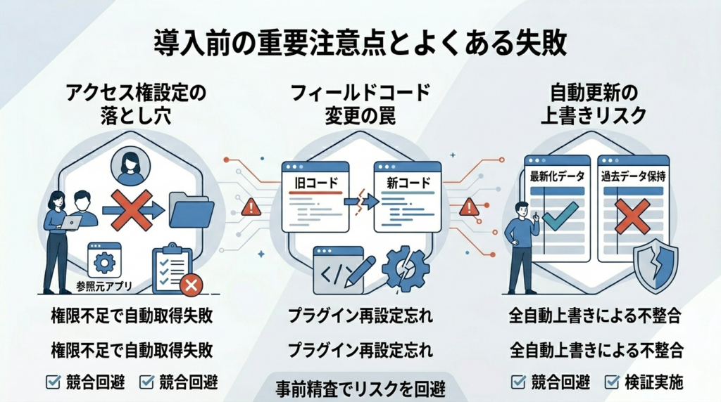 ルックアップ自動取得の仕組みを導入する際に、設定方法だけを理解していてもスムーズにいかないケースがあります。ここでは、実際の現場で頻出するトラブルとその回避策を紹介します。