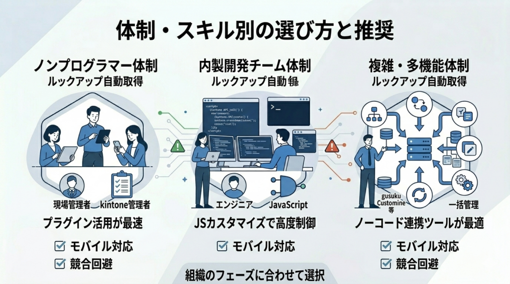 ルックアップ自動取得の実現手段を把握したところで、最後に「自社の状況に合った方法はどれか」を判断するための指針を整理します。