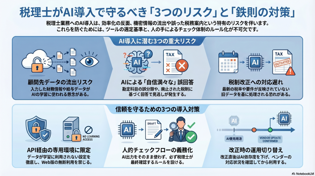一方で、AI出力の正確性チェック体制と顧問先データのセキュリティ設計は、税理士として最低限担保すべき前提条件です。この2点を後回しにしたまま導入を急ぐと、信頼を損なうリスクがあります。