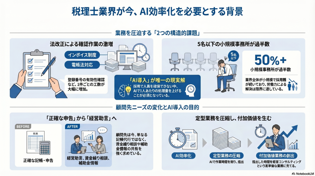 定型業務にかける時間を圧縮し、付加価値の高い経営助言・税務相談に充てる時間を作ることがAI効率化の最大の目的になっています。