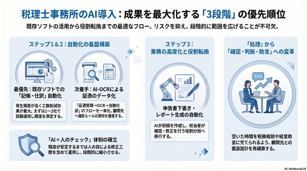 税理士業務のAI効率化は、記帳・仕訳の自動化から始め、証憑のデータ化、申告書・レポート生成へと段階的に範囲を広げるのが最も投資対効果の高い進め方です。
