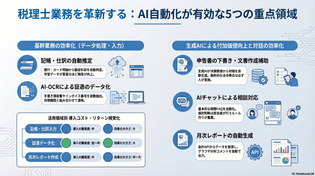 税理士業務の中でAI自動化の効果が出やすい領域を整理すると、以下の5つになります。